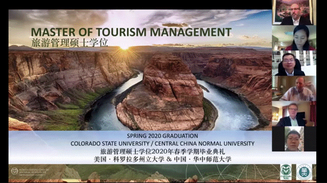 5月31日北京时间上午9点至10点,分隔大洋两岸的MTM项目中美方教职代表及2018级全体毕业生借助网络平台,参加了一场特殊而难忘的线上毕业典礼。本次毕业典礼美国科罗拉多州立大学(以下简称CSU)参会嘉宾有:人文自然系主任Mike Manfredo,MTM项目主任Sam Martin,项目教职人员Lina Xiong,David Knight,Wen Zhao及CSU旅游管理专业硕士校友代表;华中师范大学(以下简称CCNU)参会嘉宾有:中国旅游研究院武汉分院院长、MTM项目中方负责人胡静,项目中方授课老师谢双玉、龚箭、冯娟、王晓芳、李亚娟、乔花芳、程绍文、李艳及项目助理谢鸿璟,MTM2018级毕业生全体参与。