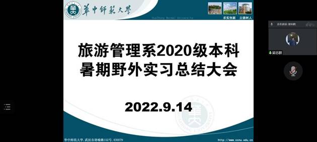 【通讯员 夏思聪】2022年9月14日上午10点至12点,旅游管理系2020级本科生暑期野外实习总结大会顺利召开。出于疫情防控需要,本次实习总结大会借助腾讯会议软件在线进行。会议由旅游管理系主任张祥主持,我院分党委书记梁志群、副院长黄建武、副院长谢双玉、分党委副书记饶艳萍、教学秘书魏幼红、2020级辅导员孟琦和旅游管理系李星明、冯娟、程绍文、李亚娟、辜红、张春燕等众多老师参加了会议,同时参会的还有2020级旅游管理专业全体本科生。