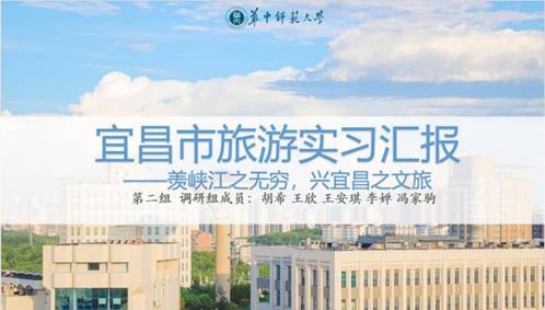 首先,王欣和胡希同学代表第二小组进行了以“羡峡江之无穷,兴宜昌之文旅”为主题的宜昌旅游实习成果汇报。她们先通过一个视频展示了宜昌市的旅游资源和此次宜昌之旅,并选取了具有代表性的四个实习点:三峡人家、三峡茶旅小镇、屈原故里、宜昌博物馆,对其旅游供需特征、景区规划布局和运营管理、旅游的影响、实习地旅游发展问题与对策进行了分析报告。她们表示,此次实习受益匪浅,让她们进一步增强了专业自信心和学习动力,她们还表达了对学院和老师的感谢。