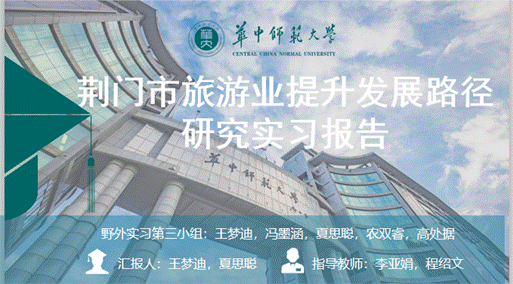 王梦迪和夏思聪同学代表第三实习小组,围绕“实习调查介绍、实习地概况、实习地旅游发展现状、实习调查发现、实习调查结论与建议”五大部分内容对荆门市的旅游发展现状及调研发现进行了完整汇报,为荆门市旅游业提升发展和各实习点旅游提升发展提供了整体思路与策略。第三组的同学还录制了视频来表达实习收获与感想,并表达了对学院领导和专业老师们的感谢。