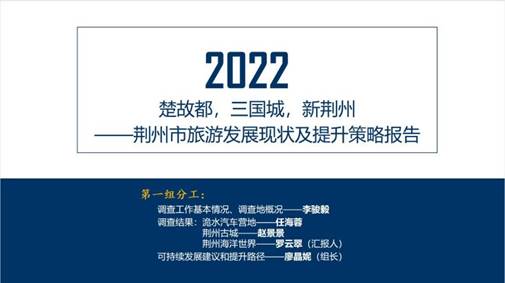 罗云翠同学代表第一小组进行了荆州旅游实习总结汇报。她以“楚故都,三国城,新荆州”为主题对荆州市的旅游发展现状进行简单概括,并对三个代表性实习点(洈水汽车野营基地、荆州古城、荆州海洋世界)进行旅游资源、空间布局、市场营销、运营管理、游客需求和满意度、旅游影响等多方面的详细报告,并介绍了该小组提出的荆州市旅游可持续发展建议和提升路径。