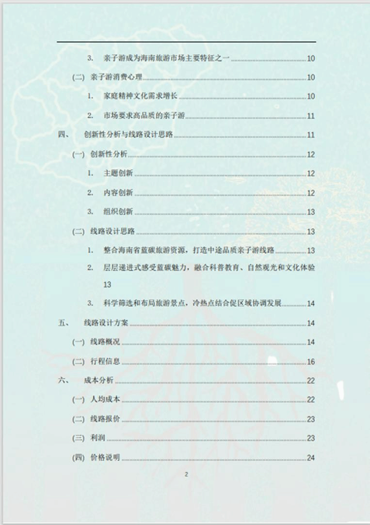 本团队作品名称为“蔚蓝碳趣,海南相遇”,线路聚焦的亲子游,结合海南大量优质旅游资源,尤其是蓝碳资源,打造海南亲子旅游线路。以“蔚蓝碳趣”为主线,亲子家庭化身“蓝碳精灵”,通过答题、闯关、打卡、植树等形式,完成整个行程。线路以蓝碳与海洋文化为基础,集观赏性、体验性、实践性、知识性为一体;设置青少年友好的安全线路、设施、内容,供孩子独立体验,让孩子能够在亲子游中得到更多体验和锻炼的机会;家长在行程中可以充当孩子的“老师”、“同伴”、“守护者”,旅行成为了一个孩子与父母之间良好互动的桥梁,增加彼此之间的亲密度。该海南亲子旅游线路集娱乐、教育、体验、亲情、休闲等于一体的亲子游,并将在保证自身线路品质下,尝试与更多不同行业进行跨界合作,寻找用户的痛点和亲子游市场尚未关注的需求。最终,该作品获得了“全国大学生海洋旅游创意设计大赛”全国二等奖的优异成绩。