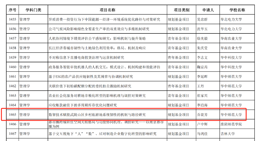 2024年7月31日,根据《教育部人文社会科学研究项目管理办法》,教育部社会科学司公示了2024年度教育部人文社会科学研究一般项目拟立项名单。其中,规划基金、青年基金、自筹经费项目共3627项通过专家评审;西部和边疆地区项目234项,新疆项目13项,西藏项目2项通过专家评审。我院乔花芳副教授主持的“数智技术赋能武陵山区乡村旅游地系统韧性的机制与路径研究”获得规划基金项目立项。