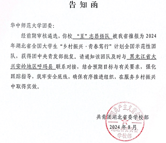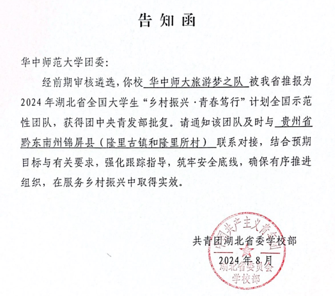 近日,我院李亚娟老师指导的华中师大旅游梦之队与乔花芳老师指导的“豆”志昂扬队均被湖北省推报为2024年湖北省全国大学生“乡村振兴·青春笃行”计划全国示范性团队,获得了团中央青发部批复。共青团湖北省委学校部要求我院团队及时与项目实践地联系对接,结合预期目标与有关要求,强化跟踪指导,筑牢安全底线,确保有序推进组织,在服务乡村振兴中取得实效。