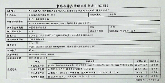 每年招生计划为30人,按照华中师范大学和美国科罗拉多州立大学共同制定的培养标准,修满32学分的学生,可获得由美国科罗拉多州立大学颁发的旅游管理专业硕士学位证书,并可在教育部留学服务中心官网进行学历学位认证。学位证书及学历学位认证报告样式如下: