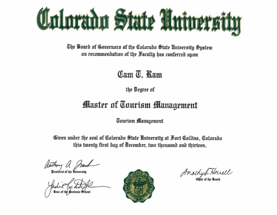 按照科罗拉多州立大学的培养标准,修满32学分的学生,可获得由美国科罗拉多州立大学颁发的旅游管理专业硕士学位证书。