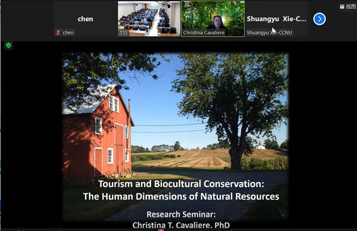(通讯员:汤晨、王晓芳)2022年11月29日上午,科罗拉多州立大学自然资源人文系副教授Christina T. Cavaliere应邀在线上为我院师生做题为“旅游与生物文化保护——基于社会生态影响调查”的学术讲座,讲座由谢双玉教授主持,程绍文老师现场进行翻译。讲座在十号楼南楼116报告厅举行,来自旅游系的多名老师及其他学生在线上和线上进行聆听、学习。