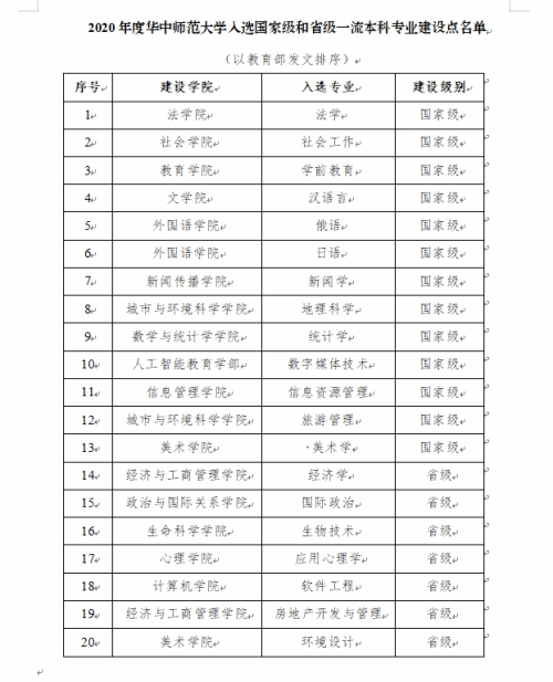 华中师范大学2020年向教育部和湖北省推荐申报20个专业,最终全部获批。旅游管理专业首次被推荐申报即获批为国家级一流专业。