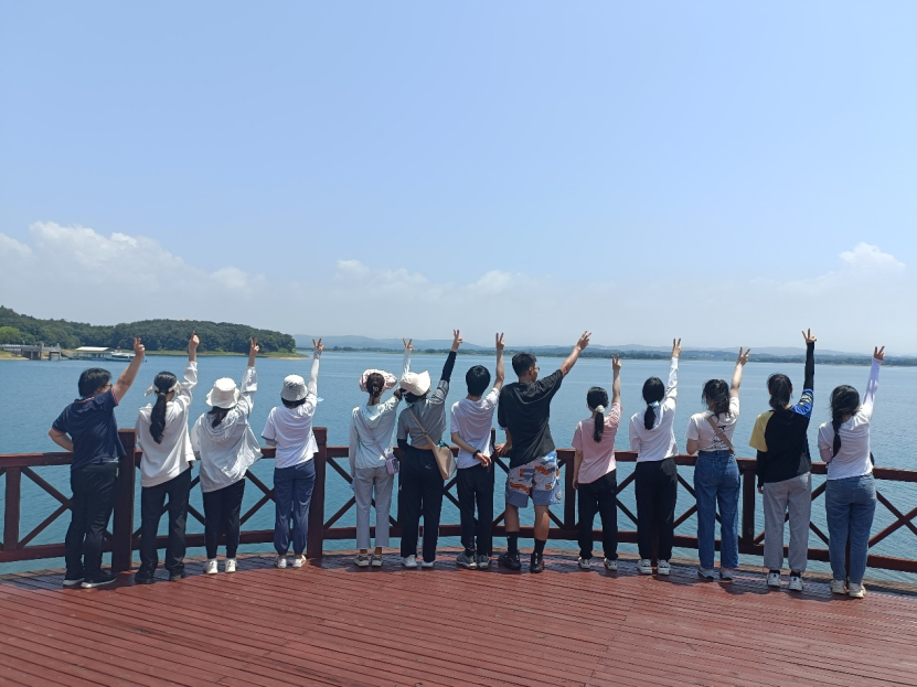 座谈结束后,同学们登上了楚天舒15号游船,到达景区核心景点之一的湖心岛进行实地考察。在40分钟左右的航程中,水天相接、碧波荡漾的漳河水库让同学们大受震撼,纷纷走出船舱记录下这份美景,也定格了同学们青春洋溢的面容。