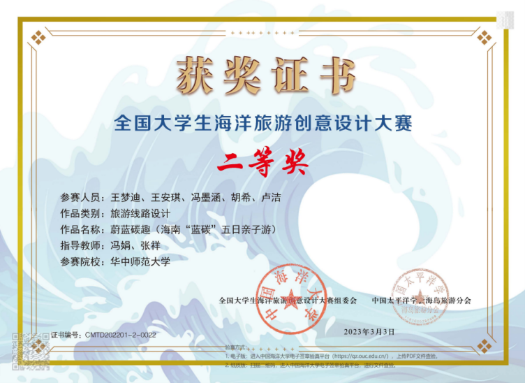我参与的竞赛主要是本专业的竞赛和英语能力竞赛,曾获全国大学生红色旅游创意策划大赛初赛二等奖和全国大学生海洋旅游创意设计大赛二等奖。关于旅游设计类比赛重点是既要有创新又要保证可行性。