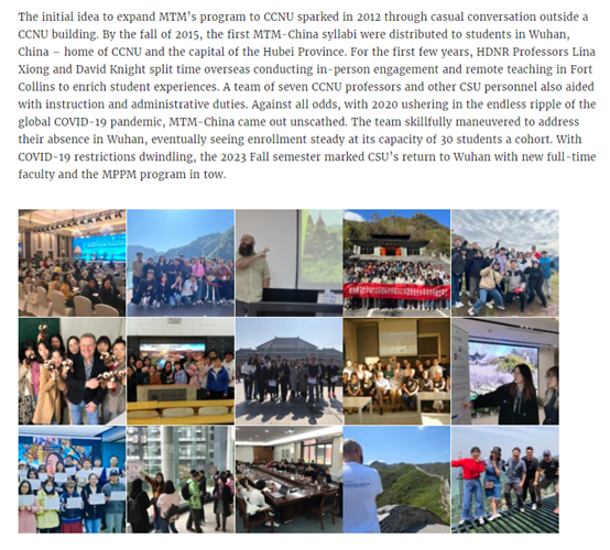 报道介绍两校合作起源于2012年科罗拉多州立大学教授到访学校时的一次闲聊,经过三年的筹备与组织,于2015年正式启动MTM项目的招生。合作期间,两校教学团队克服时差、距离和疫情等多方面的困难,结合线上线下等多渠道的教学方式,全面保障课程教学与项目运行。