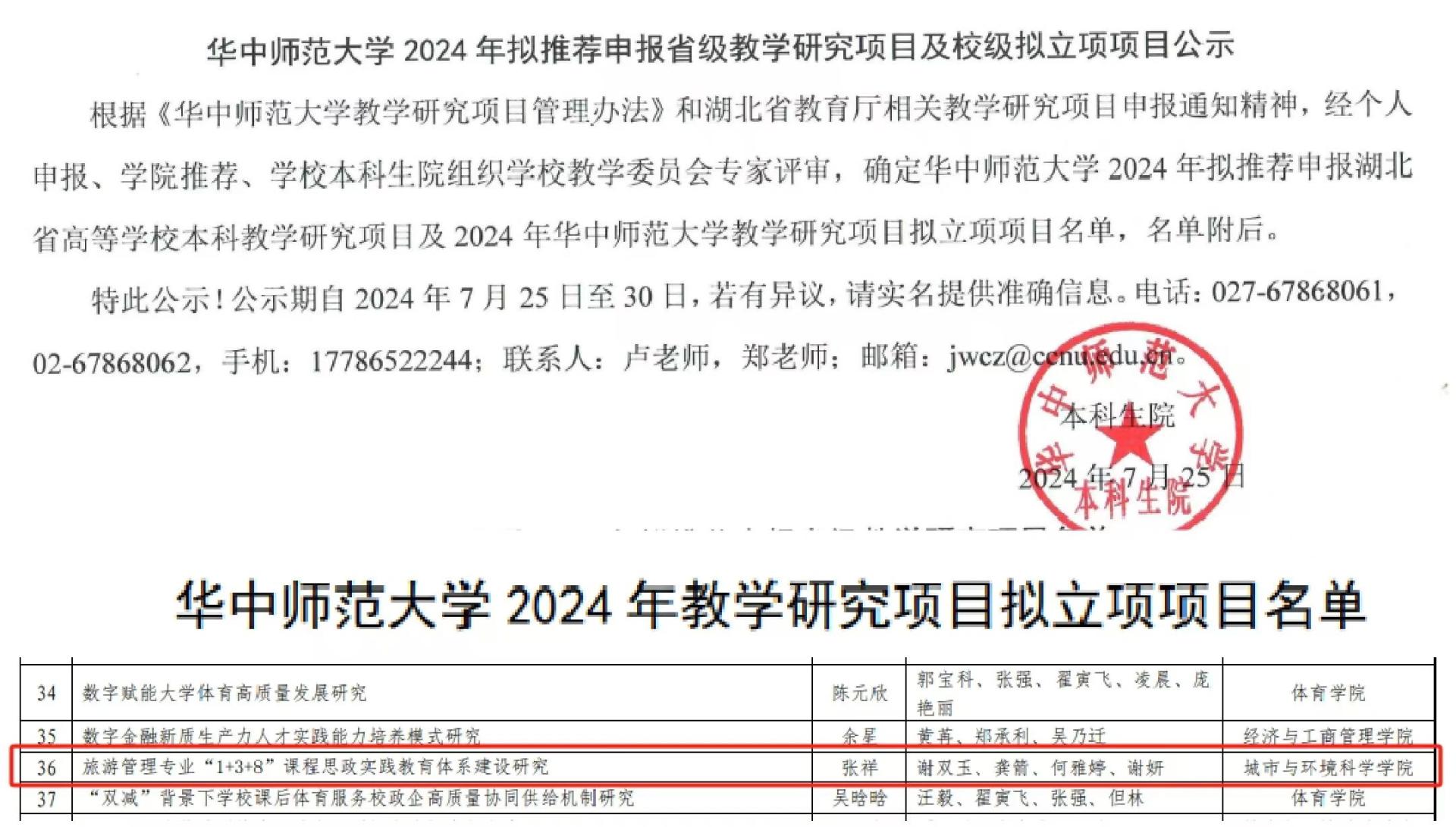2024年7月25日,华中师范大学发布了关于2024年拟推荐申报湖北省高等学校本科教学研究项目及2024年华中师范大学教学研究项目拟立项项目名单,我院由张祥副教授牵头,谢双玉、龚箭、何雅婷、谢妍等师生共同合作的“旅游管理专业‘1+3+8’课程思政实践教育体系建设研究”项目成功入选华中师范大学教学研究项目拟立项名单。