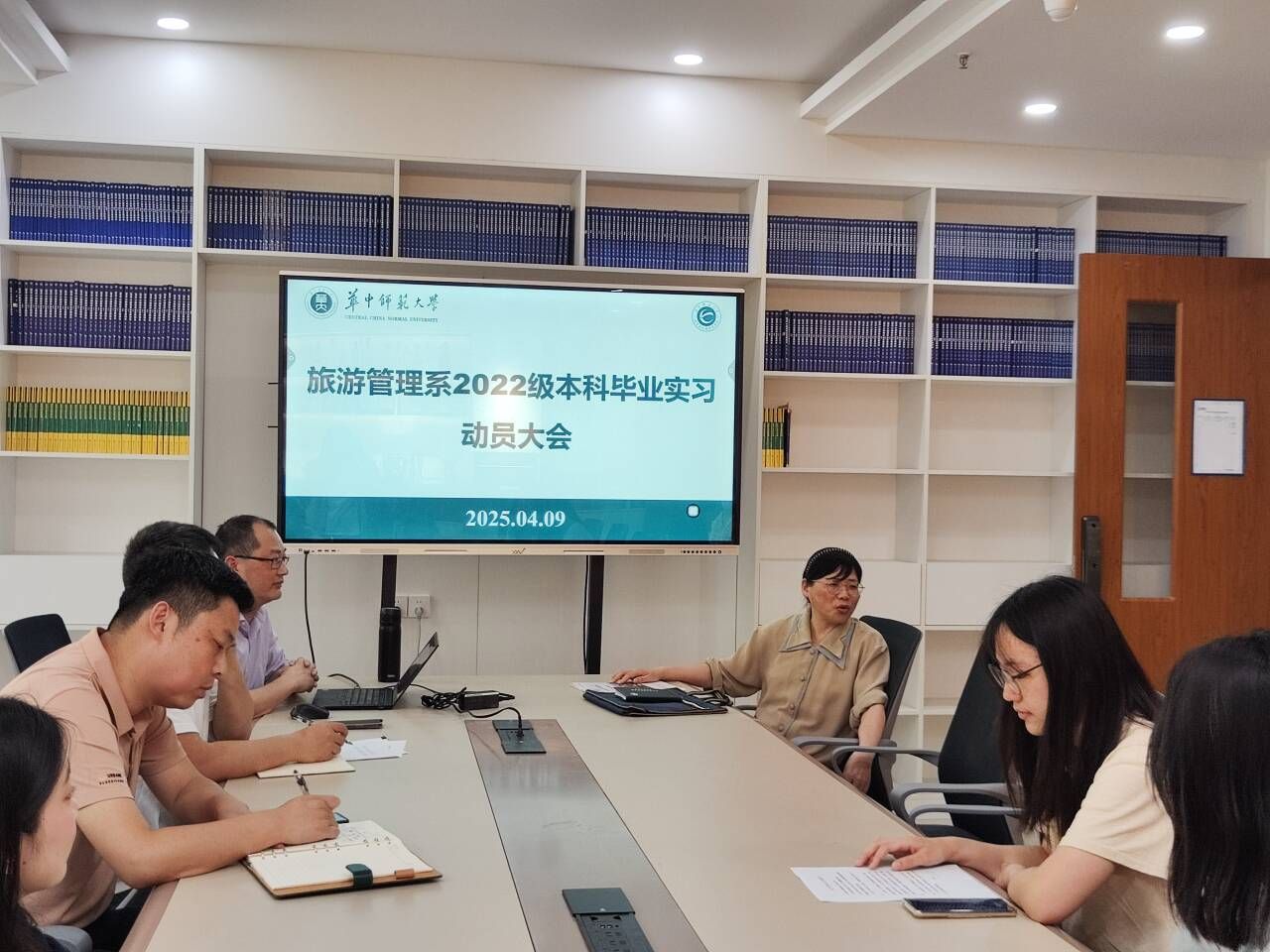 (通讯员:王悦)2025年4月9日下午,旅游管理系2022级本科毕业实习动员大会在城市与环境科学学院309会议室举行,学院黄建武副院长、李志雄副书记,旅游管理系李星明老师、程绍文老师,班主任李胜龙老师及旅游管理专业2022级全体本科生参加了本次会议,会议由系主任张祥老师主持。
