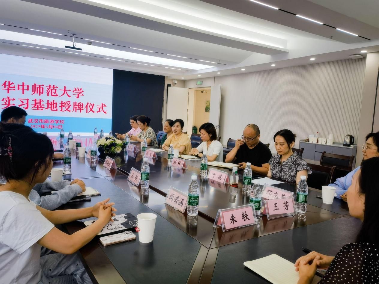此次授牌仪式由武汉市旅游学校副校长付贝主持,座谈会上,蔡沁云校长以“欢迎”、“感谢”、“希望”三个关键词表达了对华中师大城环学院一行的热烈欢迎。她充分肯定了我院实习生的专业素养,感谢学院为武汉市旅游学校输送了大批优秀人才,并期待未来进一步拓展合作领域,实现资源共享、优势互补。李志雄副书记介绍了华中师范大学的人才培养方向与教育理念,强调实践教学在育人环节中的重要性。他表示,希望以此次示范实习基地授牌为契机,进一步深化两校协同育人机制,共同培养适应行业需求的高素质人才。随后,武汉市旅游学校实习生指导教师代表叶蓓高度评价了我院实习生的表现,称赞其专业扎实、责任心强,展现了我院优良的教风教纪。实习生代表邹佳云分享了实习期间的收获与成长,表示通过一线教学实践,提升了职业能力,深化了对教育工作的理解。