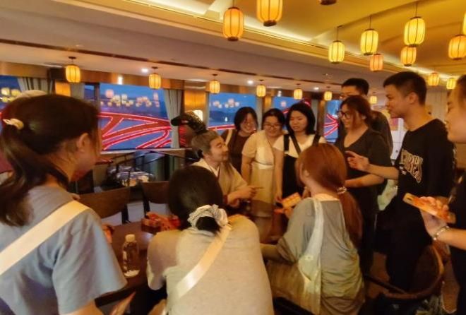 晚上七点半,在张祥、刘新星以及乔花芳老师的带领下,同学们在楚风号游轮上进行了游览参观。“楚风号”游轮是由三峡旅游集团打造的沉浸式长江楚韵移动剧场,以屈原、王昭君、李白三位历史人物为叙事主线,以楚文化图腾“凤凰”为核心意象,通过“寻凤—问道—归鸣”三大环节串联剧情,展现楚文化的千年风华。师生们欣赏了《琉璃盏·便面扇舞》《灯笼台·古风夜话》《酒肆·三献之礼》等特色演出,在互动中感受传统文化的当代演绎。