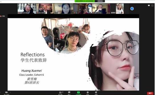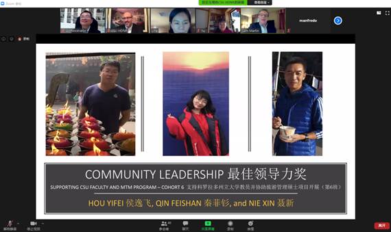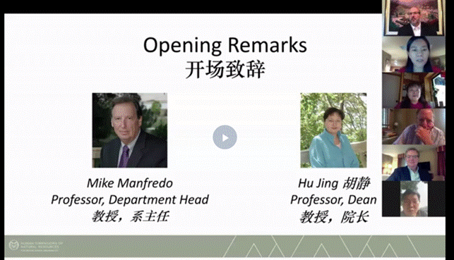 随后CSU人文自然系主任Mike Manfredo和CCNU城市与环境科学学院教授、中国旅游研究院武汉分院院长胡静先后做开场致辞,表达以线上方式和两岸师生会面的喜悦,并对在场所有结束MTM课业即将迈向崭新人生阶段的毕业生深切寄语和由衷祝福。