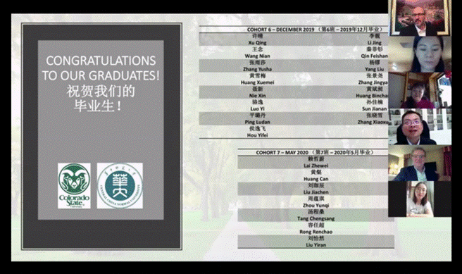 5月31日北京时间上午9点至10点,分隔大洋两岸的MTM项目中美方教职代表及2018级全体毕业生借助网络平台,参加了一场特殊而难忘的线上毕业典礼。本次毕业典礼美国科罗拉多州立大学(以下简称CSU)参会嘉宾有:人文自然系主任Mike Manfredo,MTM项目主任Sam Martin,项目教职人员Lina Xiong,David Knight,Wen Zhao及CSU旅游管理专业硕士校友代表;华中师范大学(以下简称CCNU)参会嘉宾有:中国旅游研究院武汉分院院长、MTM项目中方负责人胡静,项目中方授课老师谢双玉、龚箭、冯娟、王晓芳、李亚娟、乔花芳、程绍文、李艳及项目助理谢鸿璟,MTM2018级毕业生全体参与。