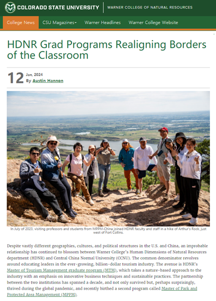 1月12日,美国科罗拉多州立大学华纳自然资源学院网站发布了题为“HDNR Grad Programs Realigning Borders of the Classroom”新闻,报道并介绍与我院合作举办区域旅游与环境(Master of Tourism Management,MTM)与自然旅游与生态保护(Master of Park and Protected Area Management,MPPM)硕士研究生教育项目的相关情况。