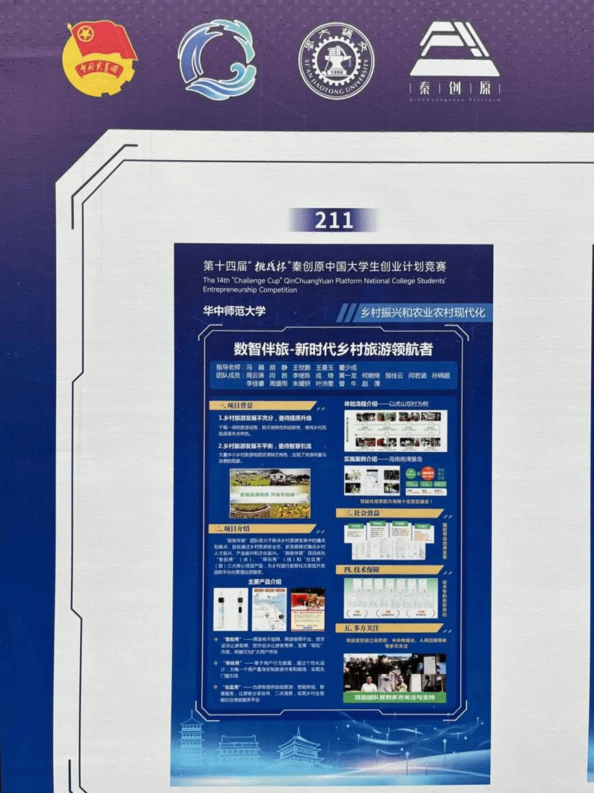 2024年10月29日-11月2日,由共青团中央、教育部、人力资源社会保障部、中国科协、全国学生联合会、陕西省人民政府主办,西安交通大学承办的第十四届“挑战杯”中国大学生创业计划竞赛全国总决赛在西安落下帷幕,经过激烈角逐,我院《数智伴旅——新时代乡村旅游领航者》项目入围国赛终审决赛,荣获主体赛国家级银奖。校团委书记苏晓刚,城环学院院长敖荣军,校团委副书记陶力,城环学院党委副书记李志雄亲临国赛现场,慰问关心我院参赛师生,为项目加油鼓劲,全程指导决赛答辩。