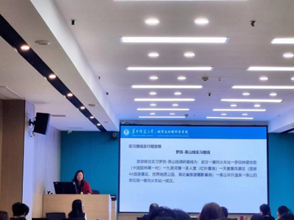 实习活动开展前期,谢双玉、胡静、李星明、张春燕、张祥、龚箭、王晓芳、乔华芳、程绍文、周杰、杨毅、周亲等多位老师就实习方案与安排等内容进行了深入的讨论与研究,并于10月22日在学院116会议室举行了实习动员会。会上,乔华芳老师对实习的整体安排进行了说明,并在小雅课程平台上布置了相关作业与任务。随后,乔花芳、龚箭、张春燕与程绍文四位老师分别就恩施线、宜昌-神农架线、罗田-英山线以及襄阳-武当山线的各项活动安排进行了详细的布置,并对不同地区的自然生态、文化生态、民族村寨等旅游地进行了介绍,以帮助同学们更好的做好实习准备,全面了解实习地的基本情况。