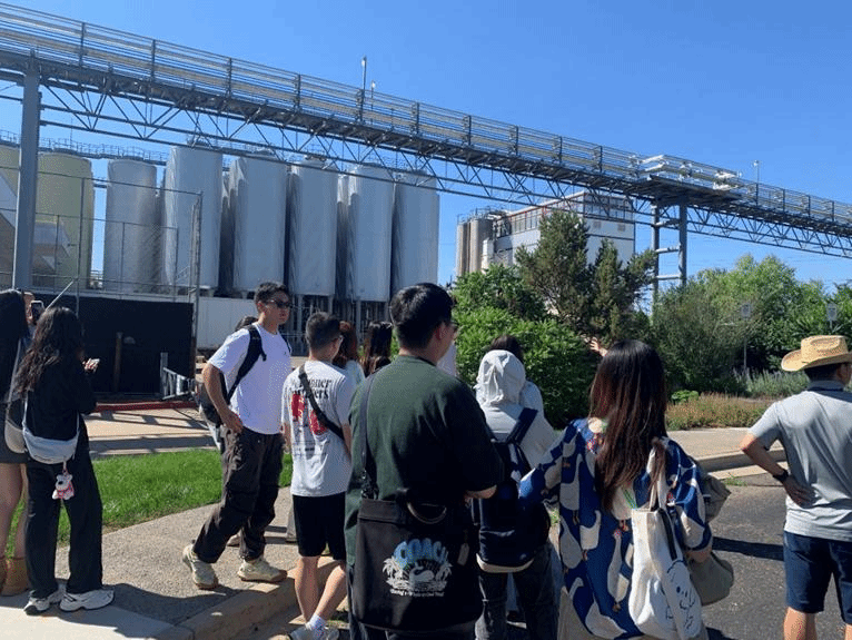 此次野外实习实践的第二站是参观柯林斯堡老城区的工业旅游点New Belgium Brewing Compan,了解“啤酒生产+旅游”的产业实践如何在老城复兴过程中发挥作用。参观过程中,同学们了解到此啤酒厂发酵啤酒利用了特殊的方法,这种发酵方法能够更好的利用周围环境中的野生酵母以及产酸细菌来对麦芽汁进行发酵,并且将酵母循环再利用,将废弃酵母释放出的甲烷气体燃烧进行发电,为整个啤酒厂发电,达到可持续发展的目的。该啤酒厂的啤酒销往世界各国,每年接待旅游者百万余人。